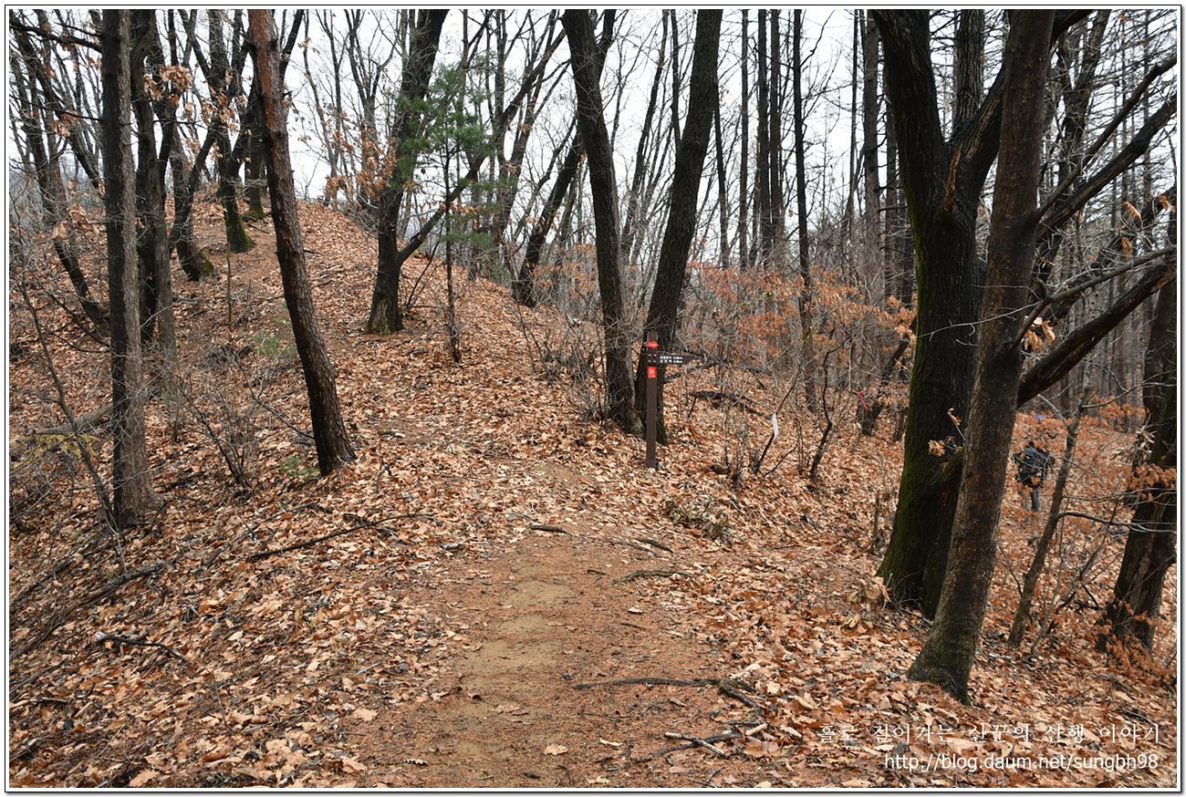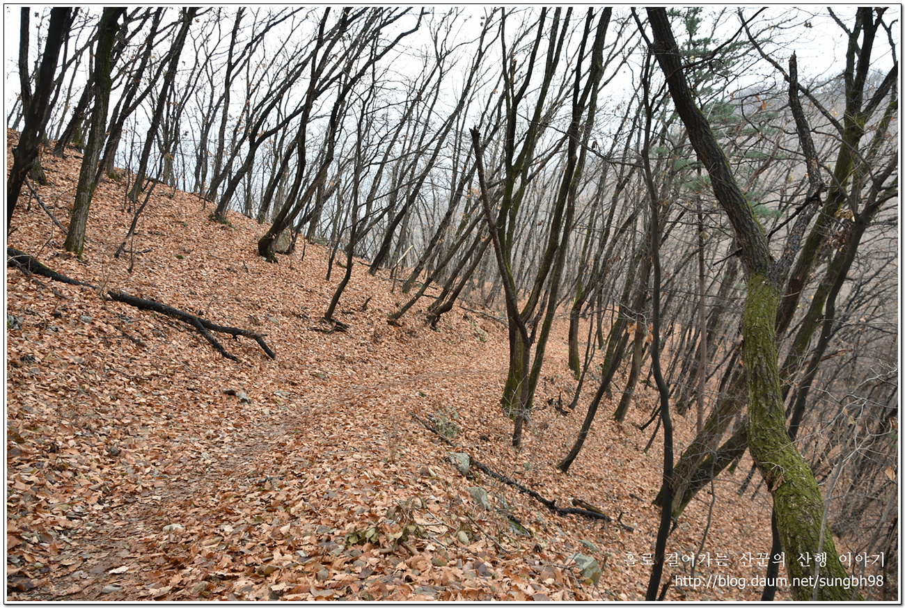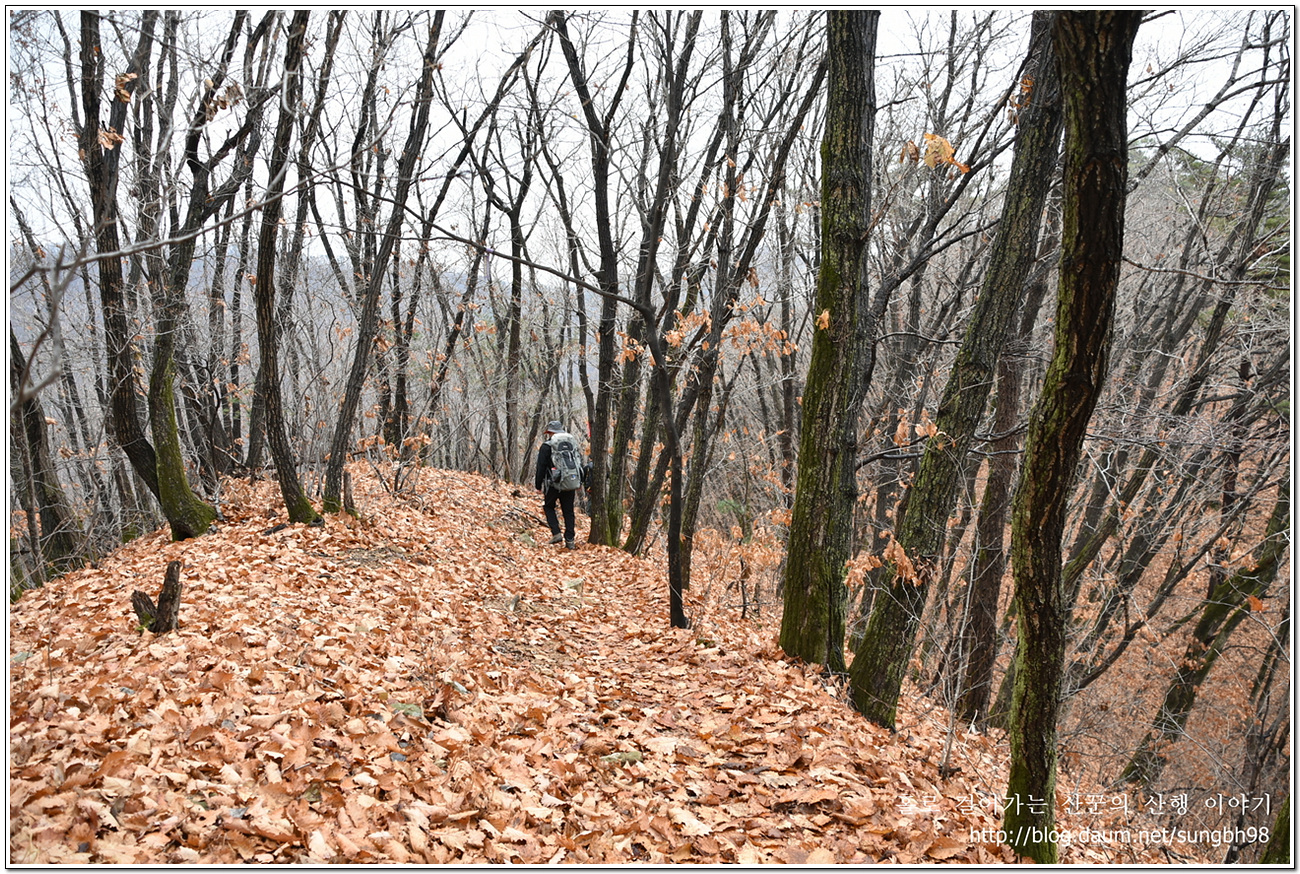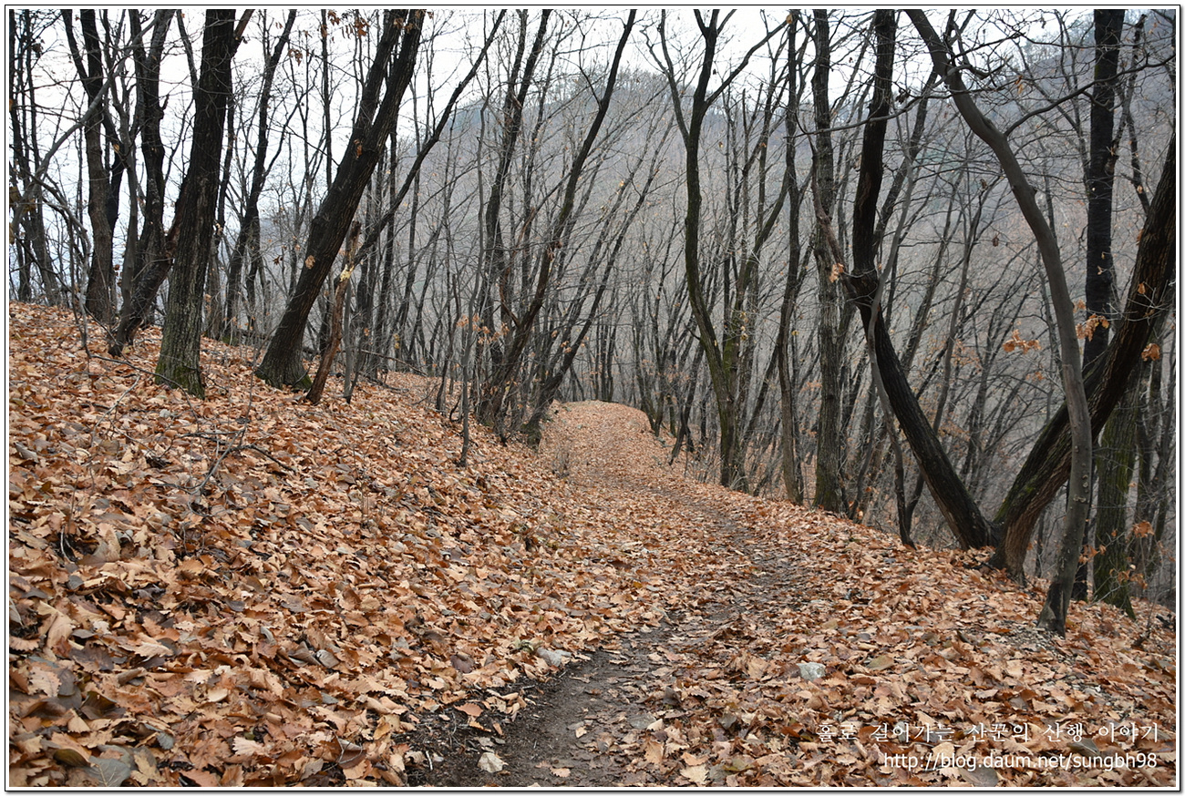 ▼ 낙엽만 수북한 한북연인지맥 마루금의 능선을 따라 걸어간다