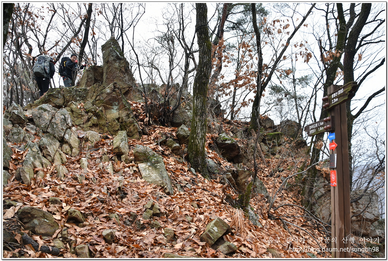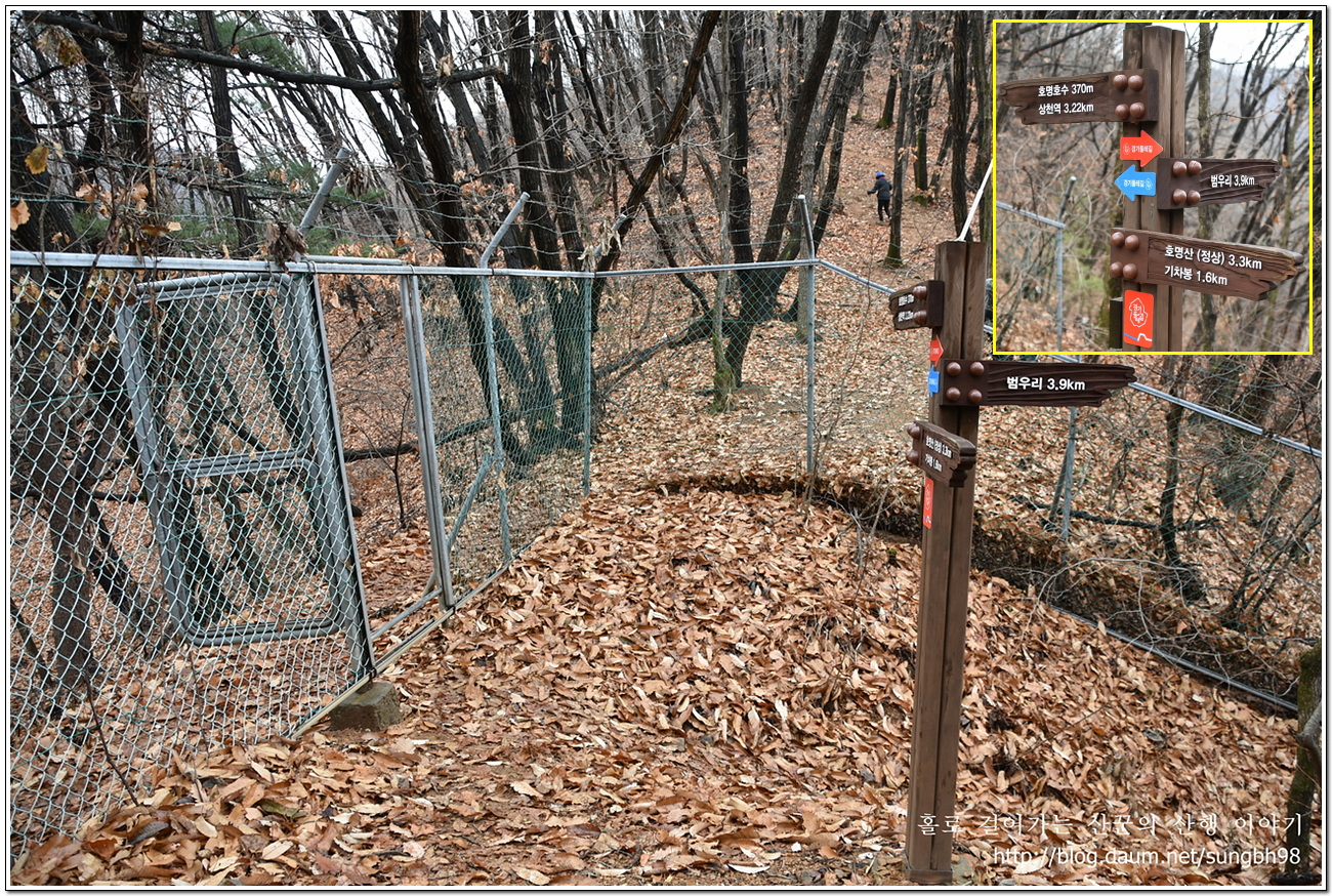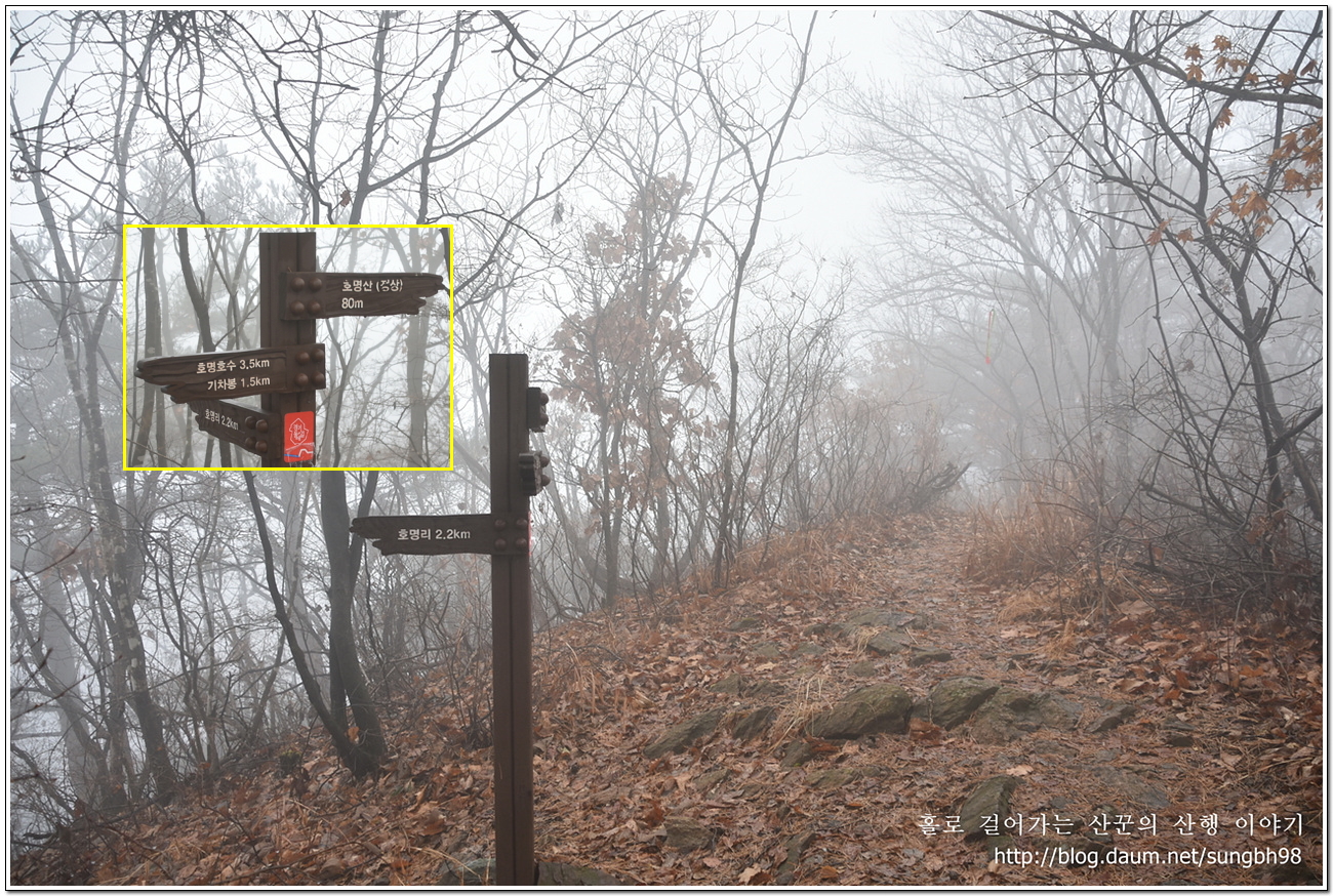 ▼ 차량 통행은 불가한 인도교를 건너 조금만 더 걸어가면 호명산 등산로 입구에 이르는데 이런 이정표가 서 있고