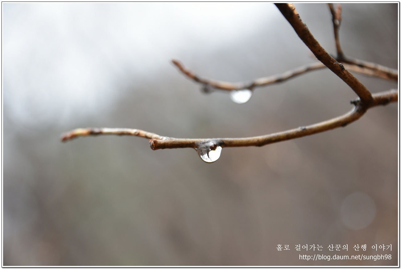 ▼ 새벽녘부터 내렸던 비가 봄소식을 전하는 것처럼 나뭇가지에 물방울이 맺혔다