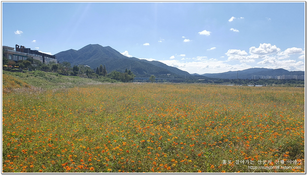 더불어 하남 검단산에서 남한산-청량산(남한산성)으로 이어지는 한남검단지맥 산줄기의 능선도 선명하고 황화코스모스가 활짝 핀 꽃밭 뒤로 예봉산 방향의 산봉우리도 보았다